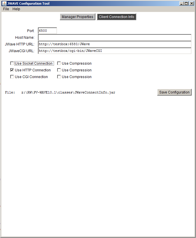 Save Configuration—Clicking this button saves the configuration to the JWaveConnectInfo.jar file (path shown to the left of the button).