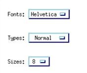 The following example shows the code used to create the items for the menus shown in Menu Bar with Menus. The menu bar contains three menus: Fonts, Size, and Icons. The contents of these menus are defined by the unnamed structure, menus, which is then passed to the WwMenuBar function. Note that the first menu, Fonts, contains a pullright menu called Adobe. This is defined as a separate unnamed structure embedded in the top-level structure.