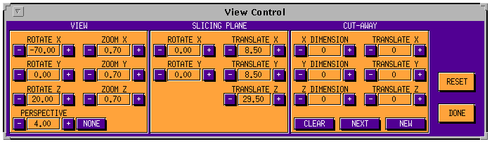 The available buttons in the View Control window are for X rotation, Y rotation, Z rotation, Perspective, and Zoom. Depending on how VIEWER is called, the Zoom keyword may consist of a single control, in which case the view is zoomed equally in the x, y, and z dimensions. There may also be three zoom controls provided, in which case the zoom factors for the x, y, and z dimensions may be set independently. There is also a NONE button provided for turning off the perspective projection.