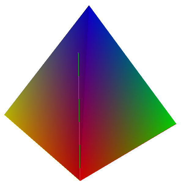 pyramid_list = [[0,0,0],[0,1,0],[1,0,0],[1,1,0],[.5,.5,1]] vertex_list = [3,0,2,4,3,2,3,4,3,3,1,4,3,1,0,4,4,0,1,3,2] color = FLOAT( [[1,0,0],[1,1,0],[0,1,0],[0,1,1],[0,0,1]] ) vtkWINDOW, XSize=800, YSize=800, Background='white' vtkPOLYSHADE, pyramid_list, vertex_list, Color=color