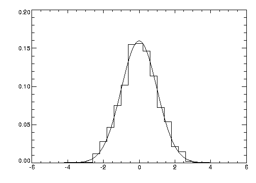 Histogram Plot illustrates this by comparing the distribution of the normally distributed random number function (RANDOMN), to the theoretical normal distribution: