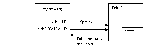 The VTK toolkit was integrated into PV‑WAVE using a Tcl shell as an intermediary. Tcl is a popular scripting language, see www.tcl.tk for more information. The VTK toolkit already has a binding for the Tcl language. PV‑WAVE spawns a Tcl shell and communicates with it using sockets, sending VTK commands formatted for Tcl.