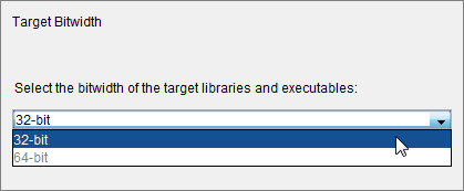 This option allows you to select whether the libraries and executables resulting from the build are compatible with 32-bit or 64-bit systems. The default value is 32-bit. If only a single choice is available, it is because the platform supports only that choice.