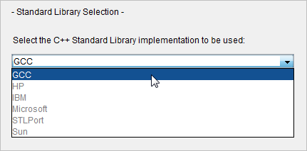 If you have selected an Oracle Studio compiler, use this dialog to choose either the vendor Oracle default standard library, or the GCC implementation; for all other platforms, the default vendor standard library is assumed, and this dialog does not display.