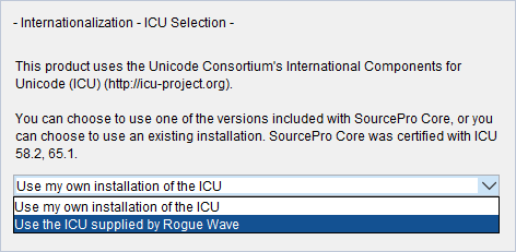 If you select Use the ICU supplied by Rogue Wave, you must choose an ICU version. If you choose Use my own installation of the ICU, you must specify the path. The default value is Use the ICU supplied by Rogue Wave.