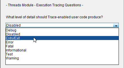 For all other trace levels, tracing code is compiled in, resulting in larger and potentially slower executables. Selecting the Entry/Exit trace level results in trace event generation for every traceable function, which can have a negative effect on application performance. For more information about the tracing mechanism, refer to the Threads Module User’s Guide.
