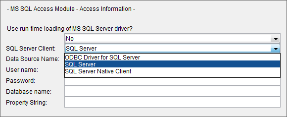 For MS SQL Access Module, there is an extra option, SQL Server Client, which can have following values: