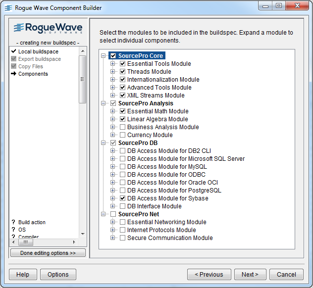 Select individual components within a set. Expanding the component’s tree structure allows you to exercise complete control over the component selection process. This allows you to fine-tune the buildspec that you are creating.