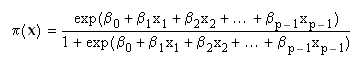 p – 1) be a collection of predictor variables. Denote the conditional probability that the outcome is present by P(Y = 1|x) =