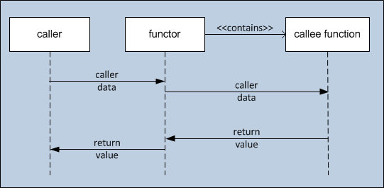 In this case, the functor contains only a function pointer. The functor just passes the argument from the caller to the function and passes the return value from the function to the caller. The process looks something like