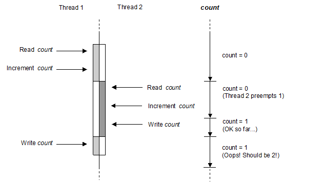 count variable, increment it, then write it back. Without synchronization, two different threads could interleave these sequences producing undesirable results, as illustrated in