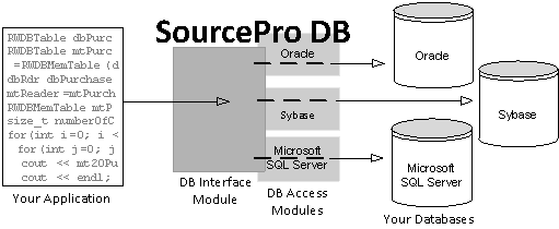 SourcePro DB is a set of C++ classes that work between a database manufacturer's API and your application. These classes are divided into two modules: