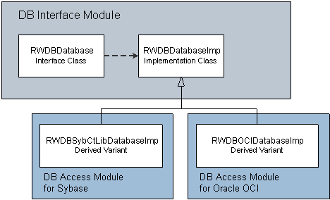 NOTE: The classes RWDBDatabaseImp, RWDBSybCtLibDatabaseImp and RWDBOCIDatabaseImp are discussed here for demonstration purposes only and should not be referenced directly or used by application code.