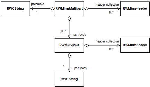 The message itself is represented as an instance of RWMimeMultipart. A multipart holds three things: a collection of RWMimeHeader objects, a collection of RWMimePart objects, and an RWCString preamble. The part body collection and the header collection may be empty. The preamble is always present, but may be an empty string.