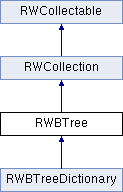 Class RWBTree represents a group of ordered elements, not accessible by an external key. Duplicates are not allowed. An object stored by class RWBTree must inherit abstract base class RWCollectable. The elements are ordered internally according to the value returned by virtual function RWCollectable::compareTo().