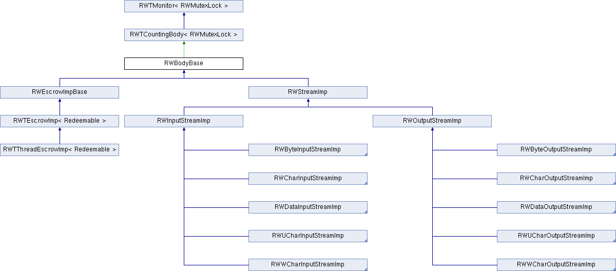 Base class for body classes. Each time an RWHandleBase instance is bound to an instance of this class, the handle instance increments the reference count inherited by the body instance. Each time a handle instance detaches from an instance of this class, the handle decrements the reference count. If the reference count reaches zero, the handle deletes the body instance. The reference counting relieves clients of the burden of having to keep track of when it is safe to delete a body instance.