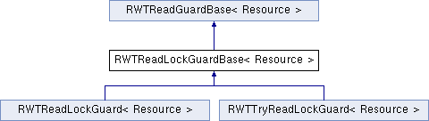RWTReadLockGuardBase is a base class for guard classes that acquire read access on a resource upon creation and release it upon destruction. Guard objects work in conjunction with block statements to establish an appropriate state upon creation, maintain that state for the duration of the block, and restore the original state upon destruction. For example, a guard may acquire read access on a mutex upon creation and release it when destructed. The class used as the template parameter Resource