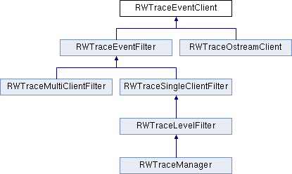RWTraceEventClient is the handle for trace event client implementations, forwarding messages to its body for processing. A client must be connected to a filter (or the global trace manager) to receive trace messages. The filter calls the trace() method each time a trace event is generated.