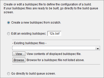 If you have never created a buildspec, you must choose Create a new buildspec from scratch. If previously created buildspecs are available to RCB, you can choose to edit those buildspecs or jump directly to the build queue screen.