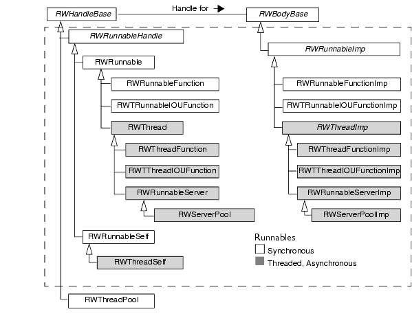 handle-body idiom. Each runnable instance consists of a protected body instance with one or more public handle instances that reference it. The hierarchy of runnable classes is shown in