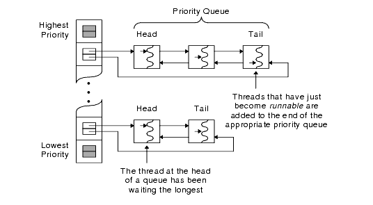 In a typical implementation, any threads in the runnable state are represented in an ordered list of queues with one list entry, or queue, per priority level. This is demonstrated in