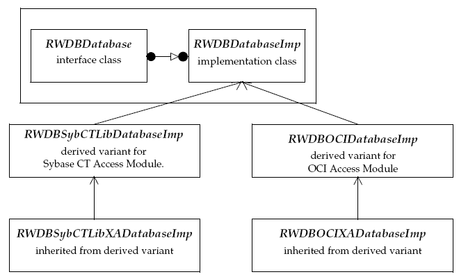 RWDBDatabase class is designed around the interface/implementation design pattern. In this pattern, a common interface hides the implementation differences of different databases.