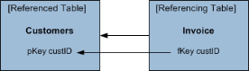A foreign key constraint ensures referential integrity between the data in the two tables, meaning that any data in the foreign key column in Invoice must exist in the primary key column in Customers. The table with the foreign key (Invoice) is the “referencing table,” and the table it references (Customers) is, logically, the “referenced table.” For example: