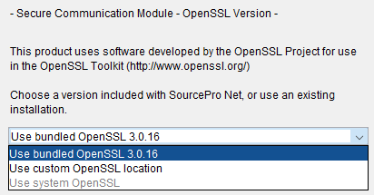 When building the Secure Communication Module, choose which OpenSSL library to use. SourcePro bundles a pre-built version of OpenSSL, or you can choose to use your own installation.