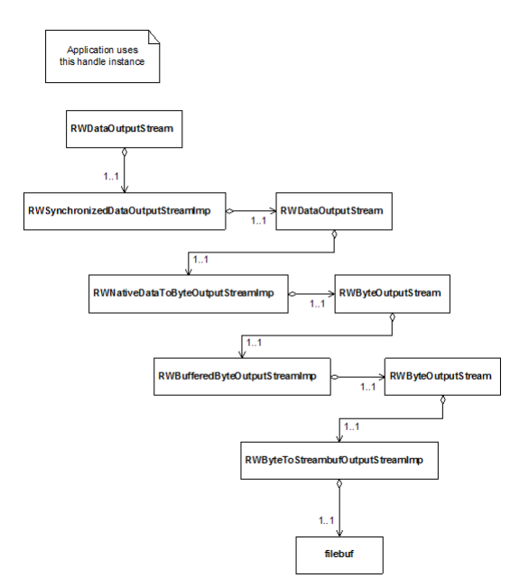 The RWNativeDataToByteOutputStreamImp stream is in turn connected to a buffered binary output stream that sends the transformed bytes to a file. The class RWBufferedByteOutputStreamImp is connected to class RWByteToStreambufOutputStreamImp to provide the buffered byte output stream. This example requires the Streams package, as well as the Execution Tracing, Thread-compatible Exception, Synchronization, Smart Pointer, Threading, Functor, and Interthread Communication packages from the Threads Module.