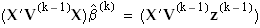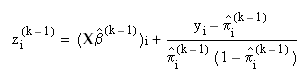 where X is the regression matrix, V(k – 1) is the diagonal matrix of variance estimates at iteration k – 1, and z(k – 1) is a vector of adjusted predictions at iteration k – 1. Element i of z(k – 1) is defined as: