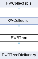 Class RWBTree represents a group of ordered elements, not accessible by an external key. Duplicates are not allowed. An object stored by class RWBTree must inherit abstract base class RWCollectable. The elements are ordered internally according to the value returned by virtual function RWCollectable::compareTo().
