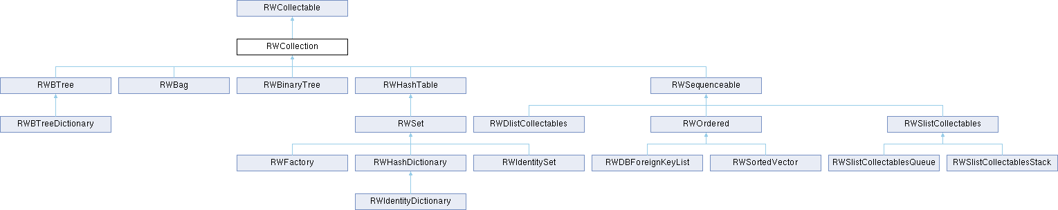 Class RWCollection is an abstract base class for the Smalltalk-like collection classes. The class contains virtual functions for inserting and retrieving pointers to RWCollectable objects into the collection classes. Virtual functions are also provided for storing and reading the collections to files and streams. Collections that inherit this base class typically redefine one or more of these functions.