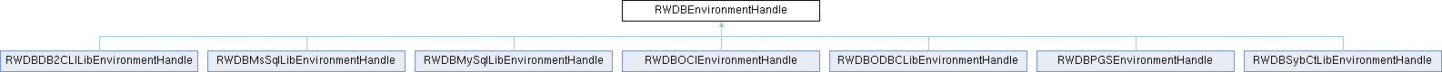RWDBEnvironmentHandle is a base class from which a family of implementation-specific classes is derived. RWDBDatabase::environmentHandle() returns a pointer to this base class. To set connect time configuration parameters or configuration properties for an entire application, the application downcasts this pointer to the appropriate type, and uses its implementation-specific features. The configuration parameters that an application can set vary widely among vendors. Please see the guide for your Access Module.