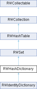 An RWHashDictionary represents a group of unordered values, accessible by external keys. Duplicate keys are not allowed. RWHashDictionary is implemented as a hash table of associations of keys and values. Both the key and the value must inherit from the abstract base class RWCollectable, with a suitable definition of the virtual function hash() and isEqual() for the key.