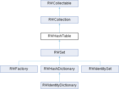 This class is a simple hash table for objects inheriting from RWCollectable. It uses chaining (as implemented by class RWSlistCollectables) to resolve hash collisions. Duplicate objects are allowed. An object stored by RWHashTable must inherit from the abstract base class RWCollectable, with suitable definition for virtual functions hash() and isEqual().