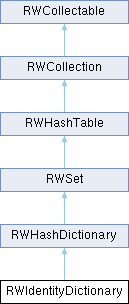 The class RWIdentityDictionary is implemented as a hash table, for the storage and retrieval of key-value pairs. Class RWIdentityDictionary is similar to class RWHashDictionary except that items are found by requiring that they be identical (i.e., have the same address) as the key, rather than being equal (i.e., test true for isEqual()).