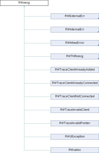 This class is the base class for the hierarchy of exceptions in the Essential Tools Module. (See the section on error reporting and handling in the Essential Tools Module User's Guide.) Although the entire class is documented here, your code usually should not create or directly throw RWxmsg objects. Instead, you should expect to write code that may catch an RWxmsg or one of its derived classes.
