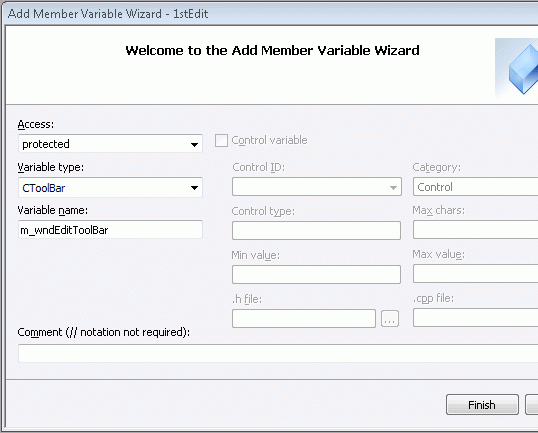 The Add Member Variable window appears, as shown in Figure 31. Add a protected member of type CToolBar, named m_wndEditToolBar.