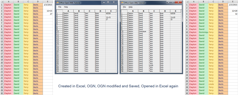 Data modification from and to an xlsx file is available. Data types include numbers as integers, strings, and dates. Formatting and formulae are not interchangeable between the GridExcelHelper assembly and Excel 2007 or higher. For example, if an Excel spreadsheet is created with colored cells, the colors will not appear in the grid control. Also, if an Excel spreadsheet contains a formula, the result (not the formula) will appear in the grid control.