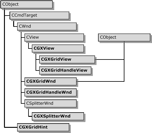 Objective Grid uses multiple inheritance to allow aggregation of functionality. With multiple inheritance, a derived class has more than one base class. For example, CGXGridView is derived from both CGXGridCore and CGXView. This means that CGXGridView inherits methods and properties from both CGXGridCore and CGXView. The reason for using multiple inheritance is that it allows your classes to be more granular, letting you pick and choose the functionality you want in your derived class, without having unneeded methods or properties just because they happen to be a member of the base class. For example, in the diagram below, CGXGridHandleView is derived from CGXView, but not CGXGridCore.
