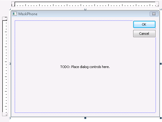 Create the dialog box for the control. In the Resources view, open the Dialog folder. It holds IDD_MASKPHONE_DIALOG. Open it and remove the static text that is already there.