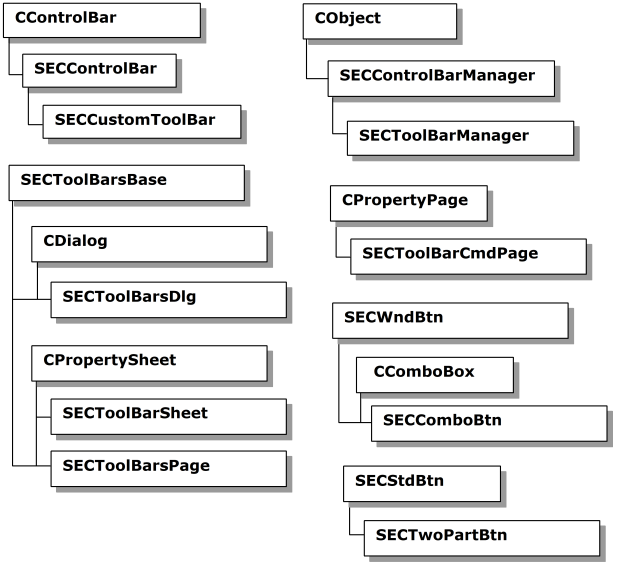 SECToolBarsBase provides the common code base for SECToolBarsDlg and SECToolBarsPage, which provide a user interface for listing and manipulating all of the toolbars. In the toolbar dialog, the user can choose from large or small buttons, enable or disable tooltips, and select a look for the application. SECToolBarsBase is a protected class. Because its constructor is hidden, this class cannot be instantiated directly.