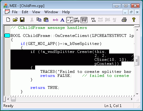 The following figure shows a simple Objective Edit MDI application with markers illustrating the syntax highlighting and gutter symbol features of a C++ source code file.