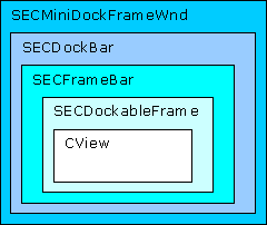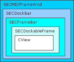 However, when the view is docked, this containment relationship changes significantly. The view is actually re-parented to a new frame window called an SECDockableFrame. The SECDockableFrame acts as a godparent. It fulfills the MFC requirement that stipulates that only frames may contain CView classes. The SECDockableFrame is in turn parented by an SECFrameBar that is SECControlBar derived. In turn SECControlBar resides in one of the dock bars belonging to the main frame. During a docking operation, only the CView survives.