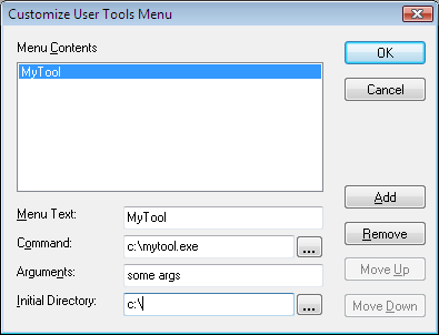 Objective Toolkit’s user-tools menu classes implement a user-configurable Tools menu like the one in Microsoft Visual Studio. A user-tool is an executable that the application can spawn programmatically. The us