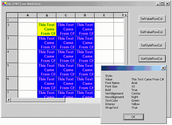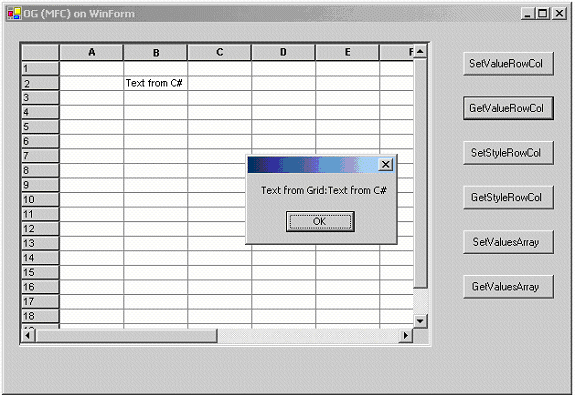 • SetValueRowCol button: sets text "Text from C#", as shown in Using the SetValueRowCol Button