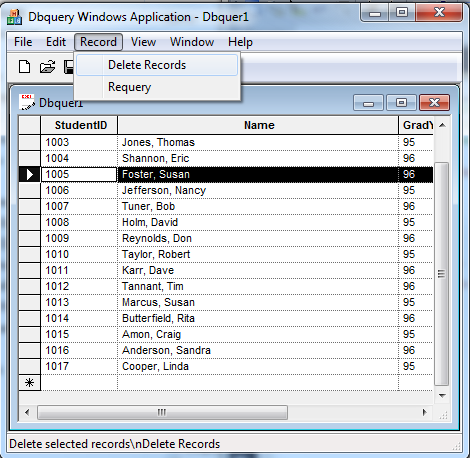 This step adds new menu items for Record|Delete Records and Record|Requery and removes the Window|New Window menu item.