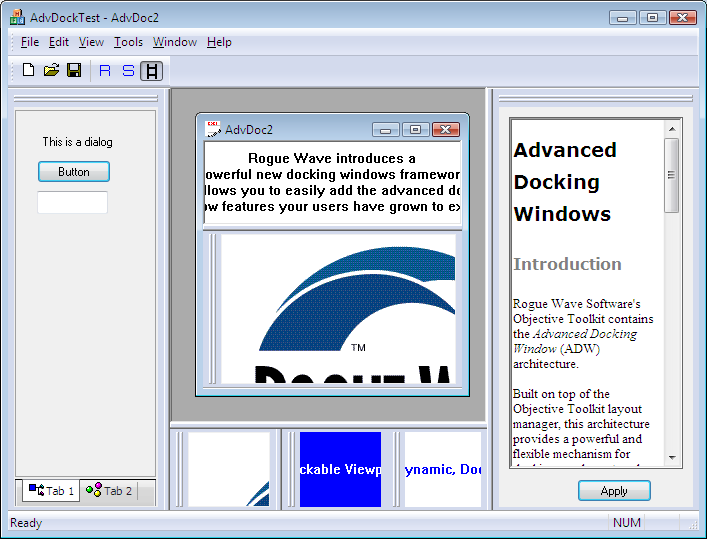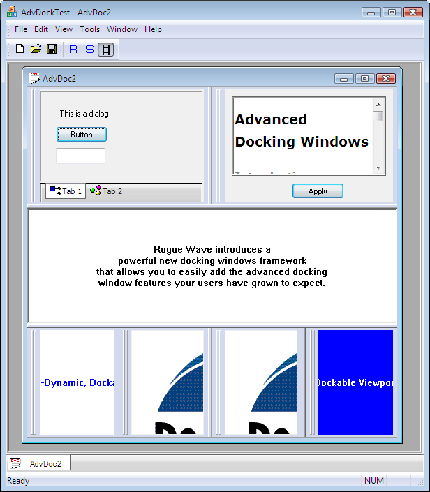 Note: At a lower level, the advanced docking architecture can be used to support any container window seamlessly. The API support is only available for docking inside frame windows.