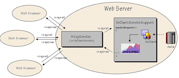 All the classes needed to build Web applications are contained in the ilog.views.chart.servlet package. The core classes of the framework are the abstract IlvChartServlet and IlvChartServletSupport classes. These classes are responsible for handling the HTTP requests received, and for sending the expected response according to the request parameters.