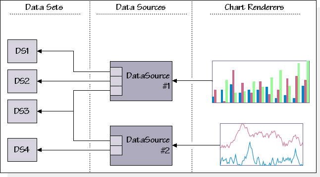 The connection between a chart and the data model is performed through a unary relationship between a chart renderer and a data source. For more information on chart renderers, how to connect them to a data source, and how to add them to a chart, refer to Handling chart renderers.